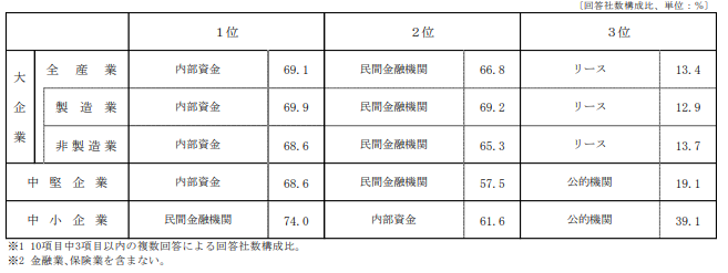 企業が事業活動や投資に必要な資金をどのように調達しているかを示します。主に「内部資金(自社の利益や貯蓄)」「民間金融機関からの借入」「リース」などの手段があります。資金調達の状況は企業の経営基盤の健全性や成長戦略を読み解く手がかりになります。