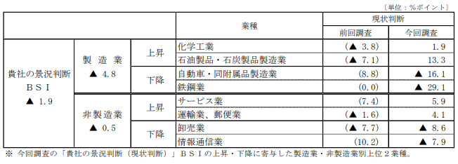 製造業や非製造業でBSIの変動に大きく寄与したのは、製造業では石油製品や自動車関連、非製造業ではサービス業や運輸業でした。例えば、石油製品製造業はBSIが大きく上昇した一方、自動車製造業は大きく低下しています。