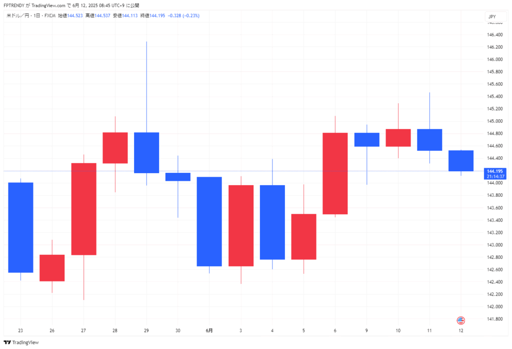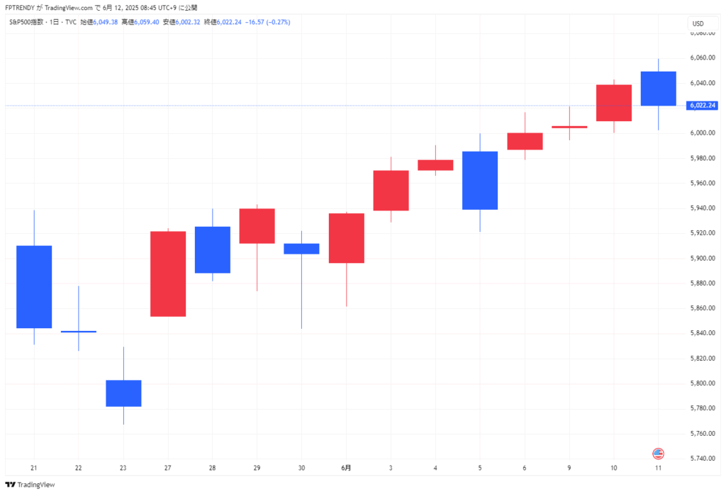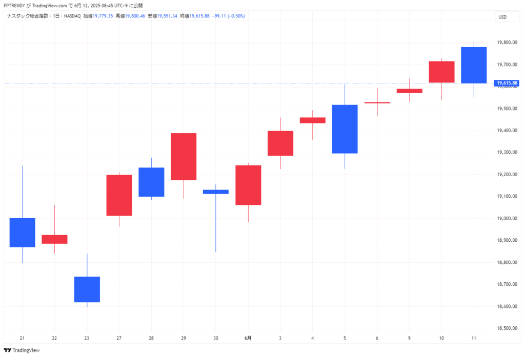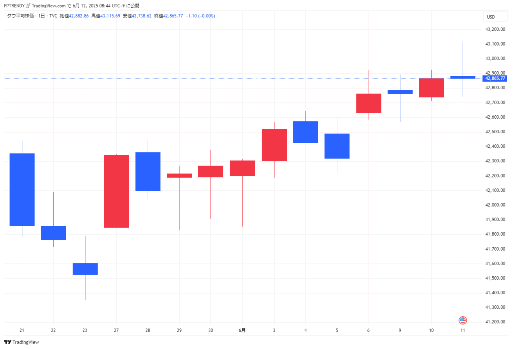 11日の米国株式市場は、ダウ工業株30種平均が小幅に反落し、前日比1ドル10セント安の4万2865ドル77セントで終了した。ハイテク株に利益確定売りが出た一方、5月の米消費者物価指数(CPI)が市場予想を下回ったことからインフレ懸念が後退し、一時は株価が上昇する場面もあった。S&P500種株価指数とナスダック総合指数はいずれも2月以来の高値圏に位置し、高値警戒感が相場の重荷となった。米中閣僚級協議で合意内容の履行が確認され、貿易摩擦の緩和期待が広がった。