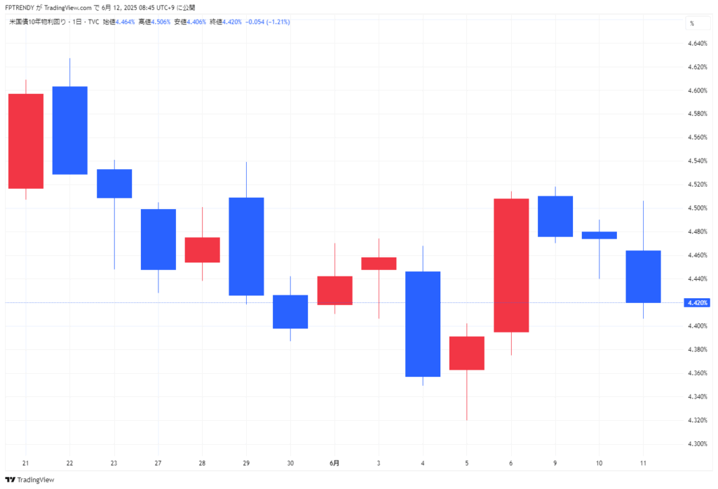 - 10年物国債利回りは前日比0.05%低い4.42%で終了。