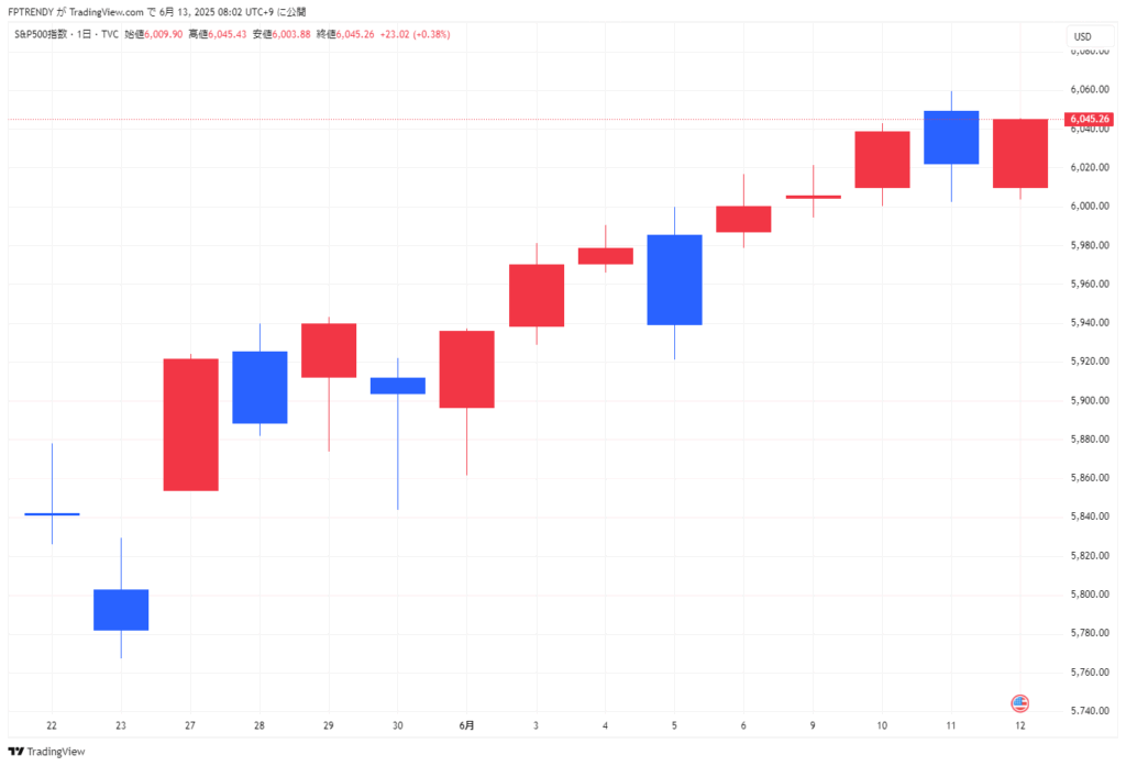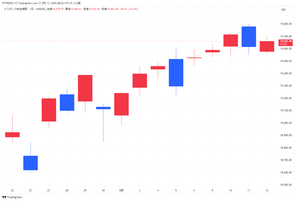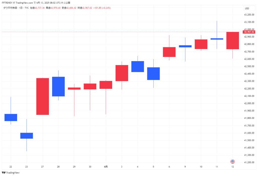 2025年6月12日米国市場動向(ダウ平均株価、S&P500、ナスダック総合指数、米国国債10年物利回りなど)