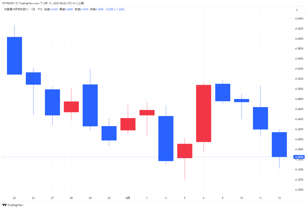 米10年国債利回りは前日比6ベーシスポイント低い4.36%程度まで低下しました。