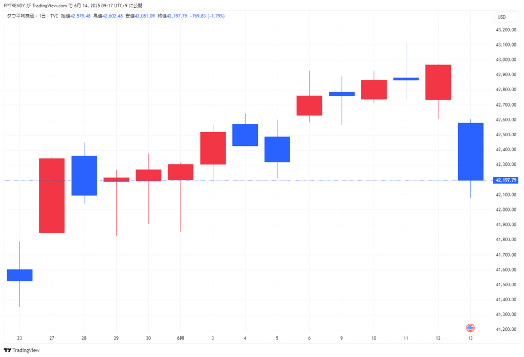 ダウ工業株30種平均は769ドル83セント安(-1.79%)の 4万2197ドル79セント と大幅に反落しました。中東情勢の緊迫化を受け、投資家のリスク回避姿勢が鮮明となり、下げ幅は一時800ドルを超えました。