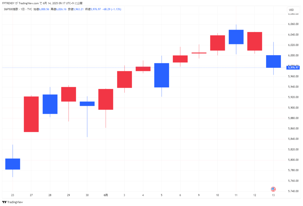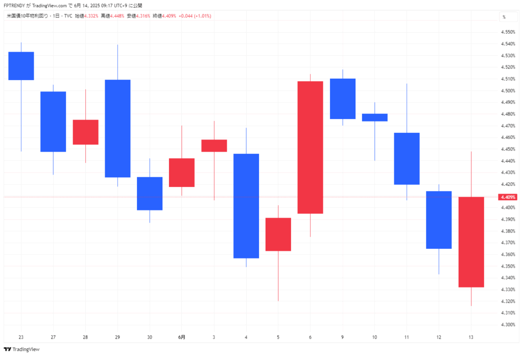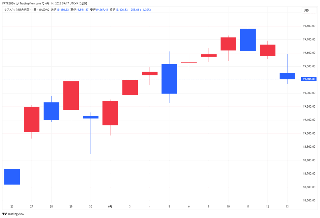 2025年6月13日米国市場動向(ダウ平均株価、S&P500、ナスダック総合指数、米国国債10年物利回りなど)