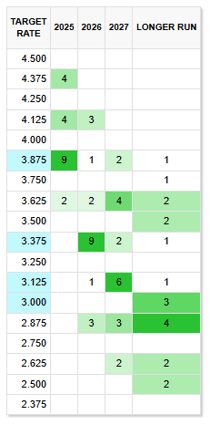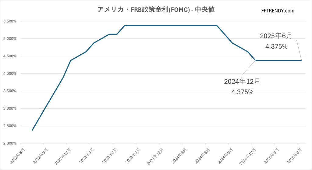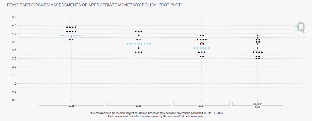 FRBは今回で4会合連続となる政策金利据え置きを選択。インフレ率は目標の2%前後で推移し、失業率も低水準を維持しているが、足元の消費減速や貿易摩擦の影響が景気にじわりと足かせをかけ始めているとの判断が背景にある。新たに公表されたドットチャートでは、FRB担当者の中央値予測として今年2回の利下げが依然見込まれる一方、利下げなしを予想するメンバーも増加し、内部に意見の分かれも見受けられた。