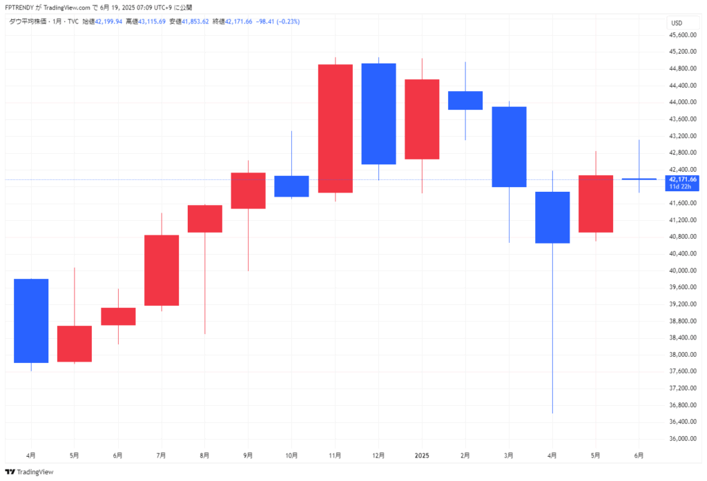 ダウ工業株30種平均は、前日比44ドル14セント安(0.10%安)の42,171ドル66セントで取引を終えました。パウエル議長による利下げ慎重姿勢の表明が売り要因となり、米関税政策や中東情勢に対する警戒感も相まって小幅に続落しました。