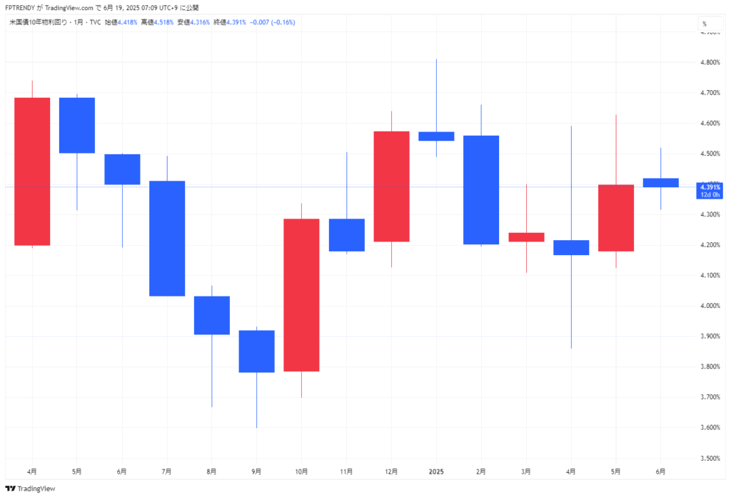10年物国債利回りは、4.39%で横ばい推移となりました。イラン・イスラエル紛争を受けた安全資産需要と、FOMC後の利下げ見送り観測が相殺し、目立った動きはみられませんでした。