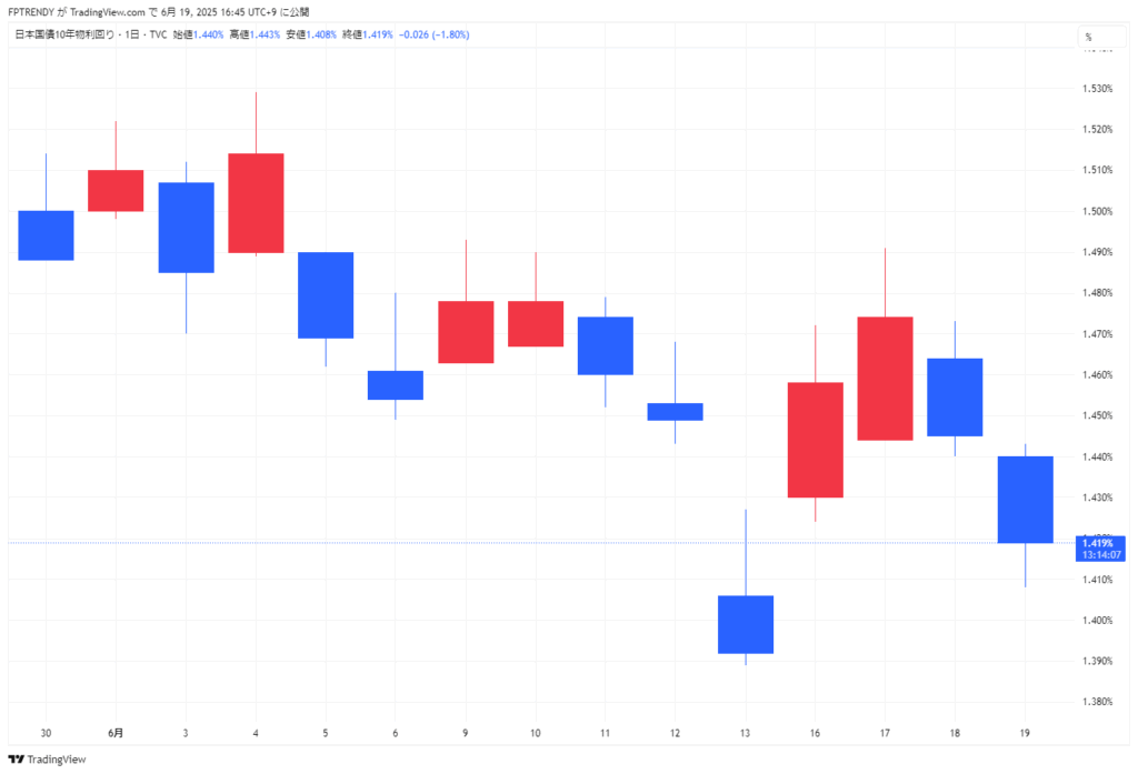 新発10年物国債の利回りは0.035%低下の1.410%となり、債券価格は上昇。中東リスクの高まりが安全資産としての国債需要を押し上げた。19日に実施された財務省の5年物国債入札も、一定の需要が見られたとの受け止めから、市場を支える要因となった。