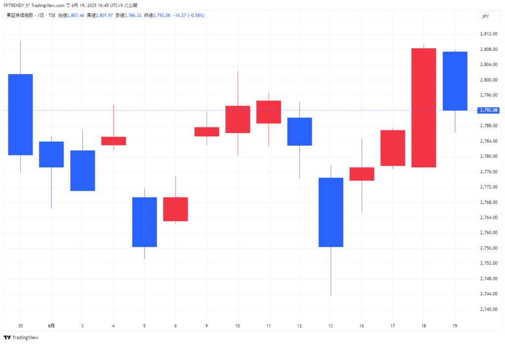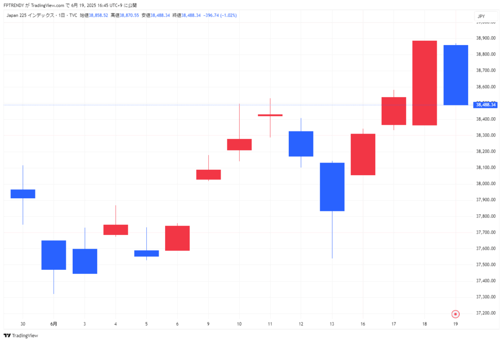 19日の東京株式市場は、日経平均株価が前日比396円安と4日ぶりに反落。前日までの続伸による利益確定売りが優勢となり、半導体関連株を中心に売りが広がった。中東情勢の緊迫化が市場心理を冷やし、リスク回避の動きも見られた。米国が祝日で休場だったこともあり、積極的な買いは手控えられた。