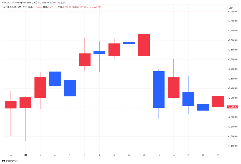 - ダウ工業株30種平均は前営業日比35.16ドル(0.08%)高の42,206.82ドルで取引を終え、3営業日ぶりの反発となった。イスラエル・イラン間の外交協議進展への期待が先高感を支えた。