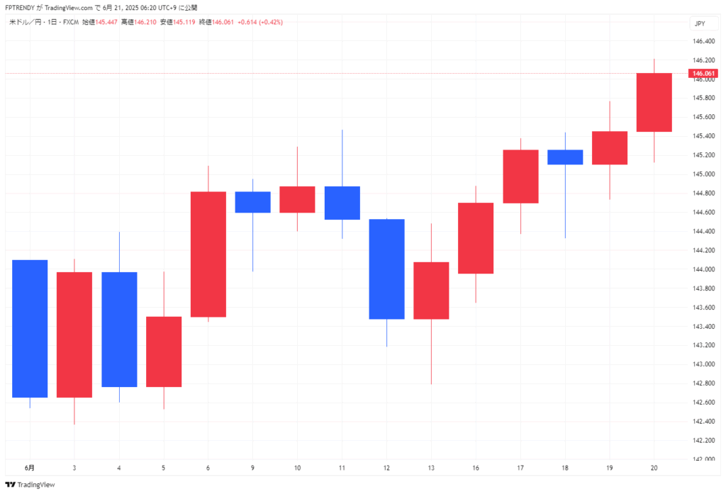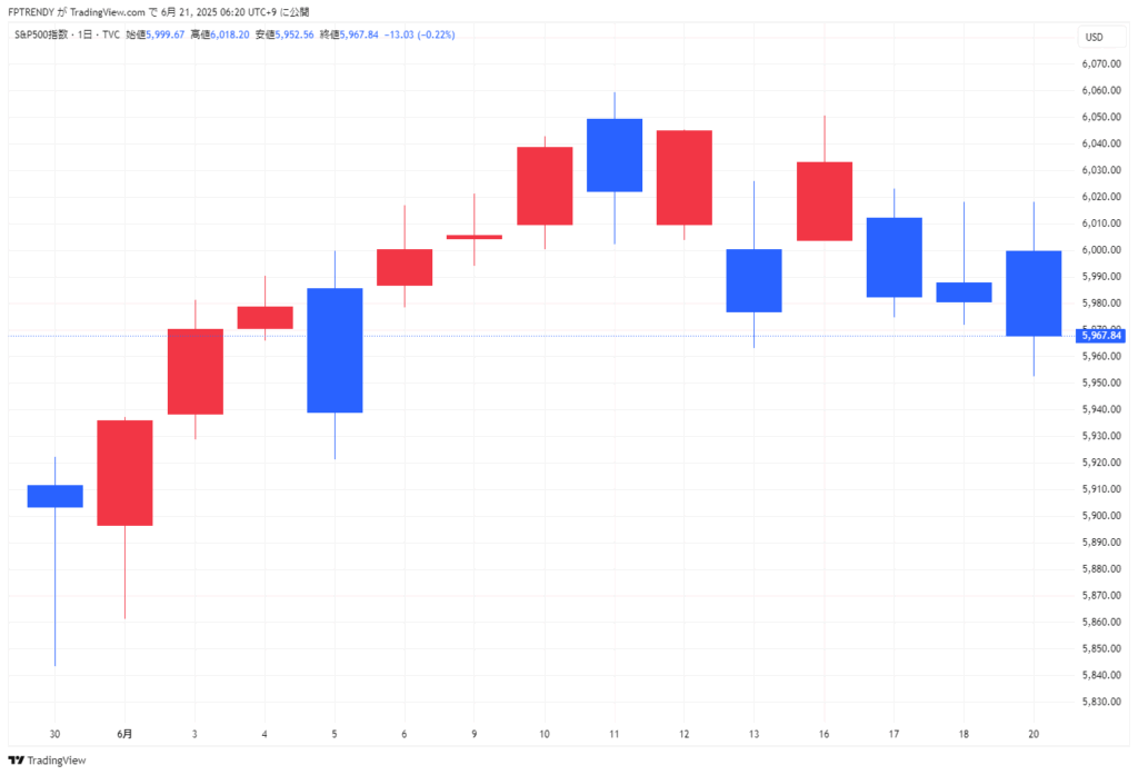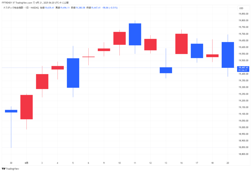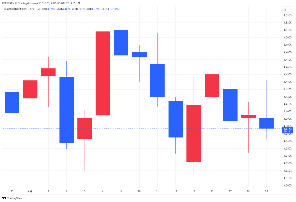 6月20日のニューヨーク市場では、ダウ平均が3営業日ぶりに反発した一方で、ナスダックは反落。10年物国債利回りは前営業日比0.02%低下の4.37%と長期債が上昇し、2年債利回りも3.91%まで低下した。FRB理事ウォラー氏の早期利下げ観測発言が債券買いを誘い、市場センチメントに影を落とす半面、中東情勢の交渉進展期待が株式相場を下支えした。