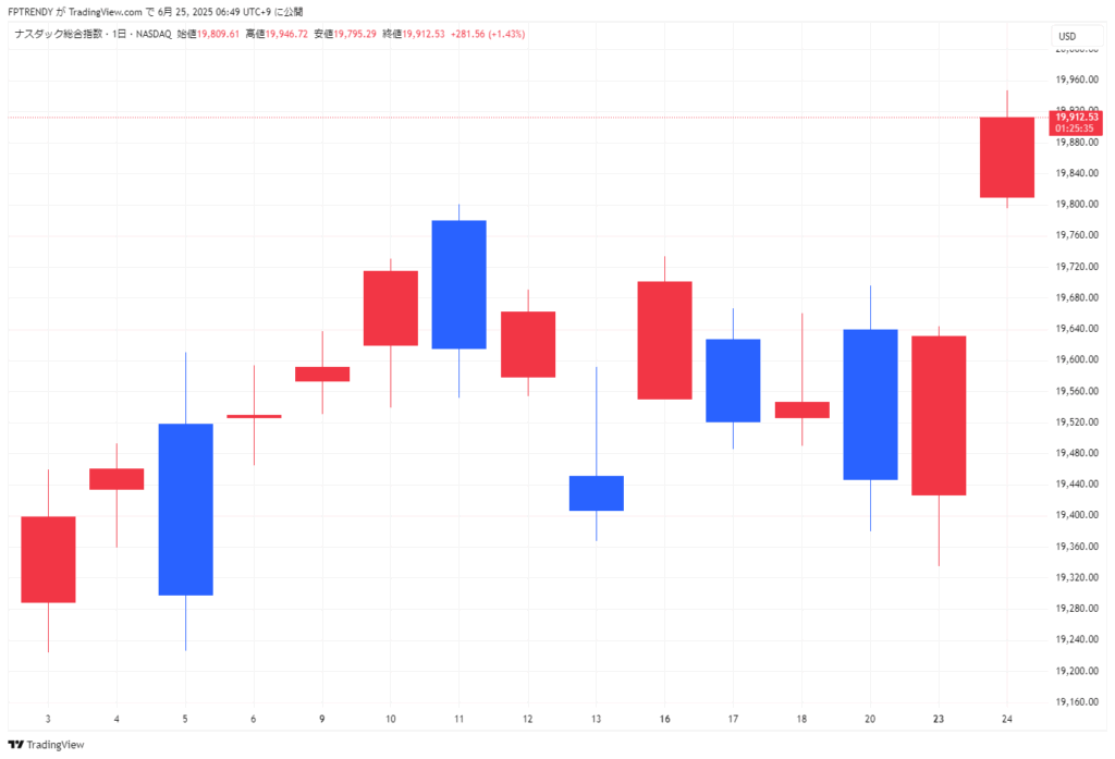 前日比507ドル24セント(1.19%)高の43,089.02ドルと3日続伸。3月上旬以来の高値を記録し、金融・ハイテクからディフェンシブまで幅広い銘柄に買いが入った。 - ナスダック総合指数