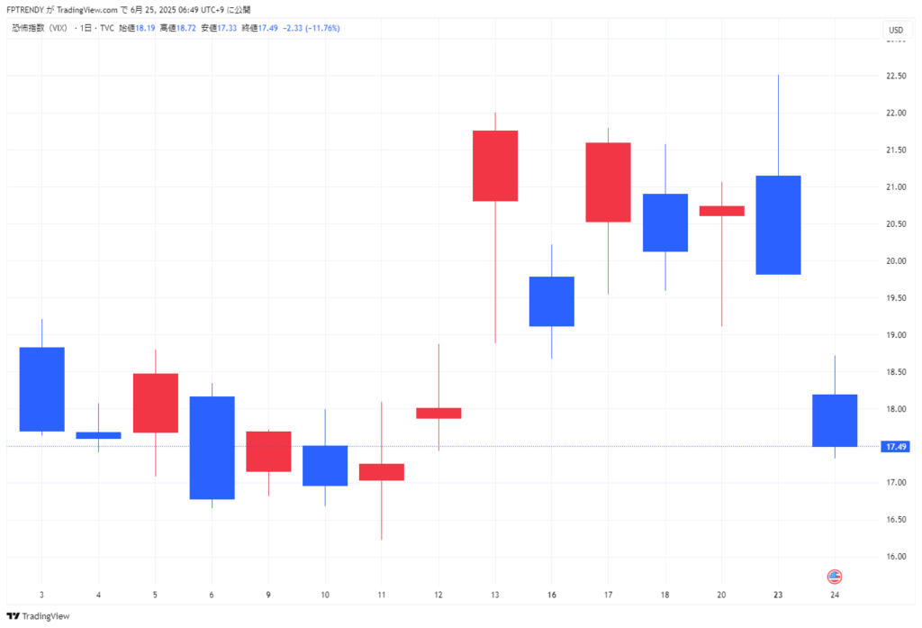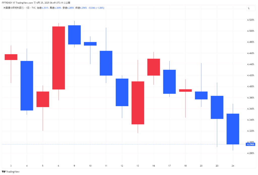 6月24日のニューヨーク市場では、中東情勢を巡る過度な警戒が和らぎ、原油相場の下落を受けて円が3営業日ぶりに反発。消費者信頼感指数の悪化もドル売り要因となり、米長期債が3日続伸、10年債利回りは低下した。一方、停戦合意への期待や原油安を背景に株式市場は主要3指数ともに3日続伸し、いずれも2月中旬以来の高値水準を回復した。