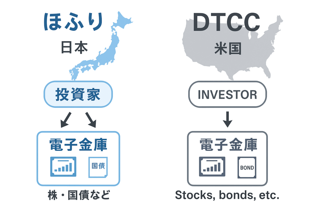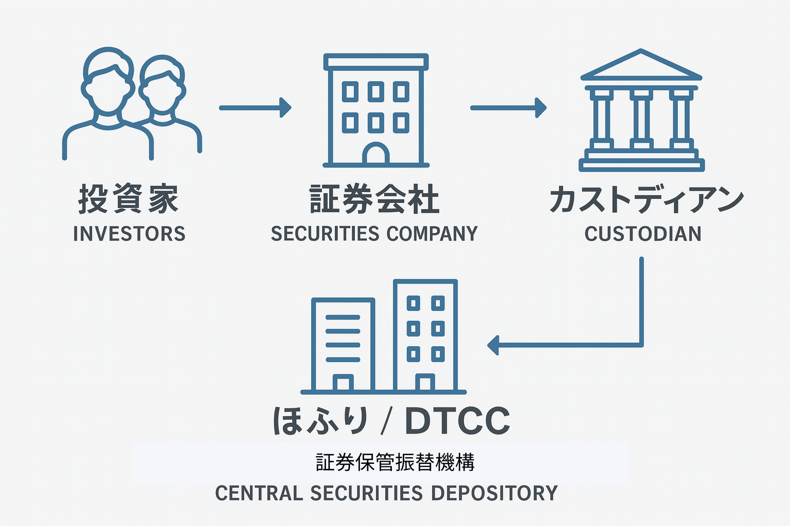 📍 図解ポイント:「投資家 → 証券会社 → カストディアン → ほふり/DTCC」の流れ図