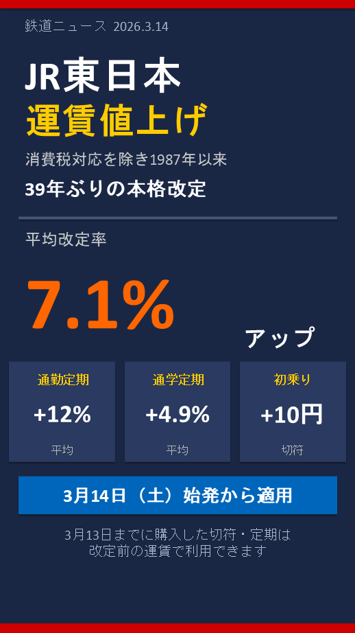 JR東日本が3月14日から運賃を値上げする。値上げは消費税の導入や引き上げに伴うものを除けば、1987年の会社発足以来初めて——つまり39年ぶりの本格的な改定だ。