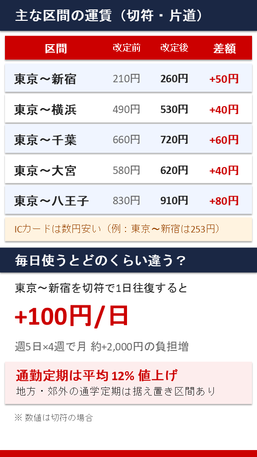 たとえば東京〜新宿を毎日1往復するだけで、切符なら1日100円の追加負担になる。定期券を使う人でも、通勤定期は平均12%の引き上げのため、月単位で見るとまとまった額の差が出る。
