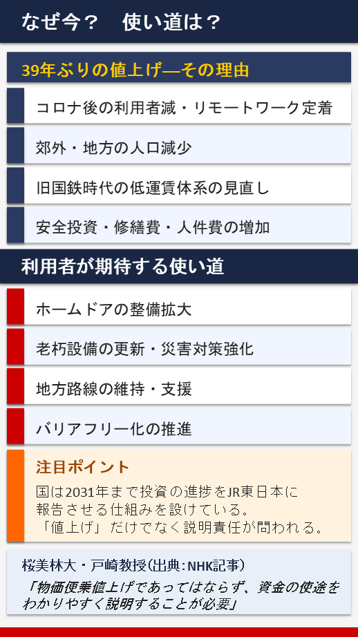 今回のJR東日本の値上げは、39年間据え置かれてきた運賃体系の構造的な見直しという側面が強い。コロナ後の需要変化、安全投資の必要性、地方路線の維持——いくつかの理由が重なって「今」になった。