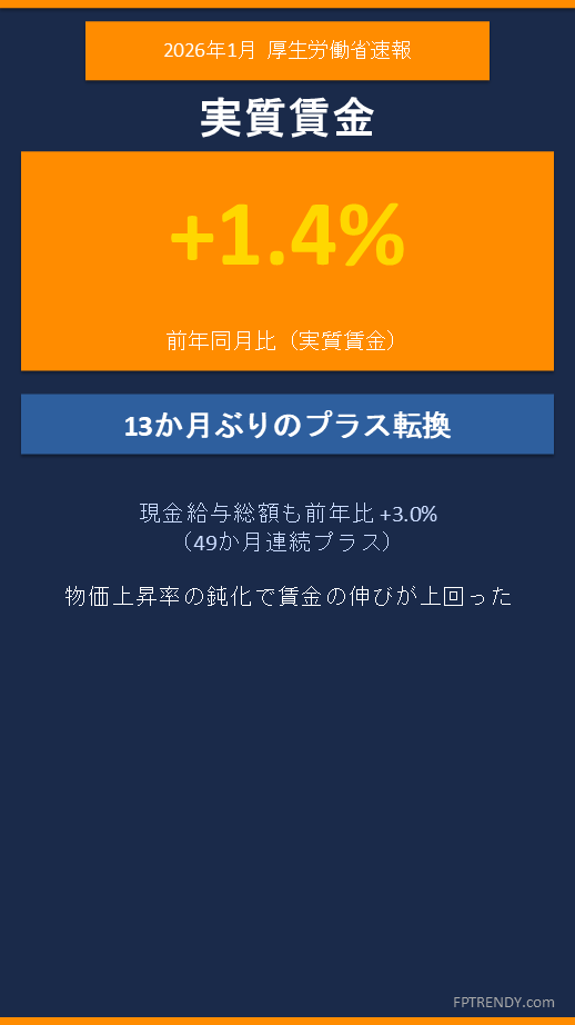 2025年を通じて、物価高が賃金の伸びを上回る状況が続いていた。家庭の食費や光熱費の高さは肌感覚として残っており、統計の数字と生活実感の間にギャップを感じていた人も少なくないはずだ。今回のプラス転換は、その流れが変わりつつあるサインとして受け取れる一方で、まだ1か月分のデータにすぎない点には注意が必要だ。