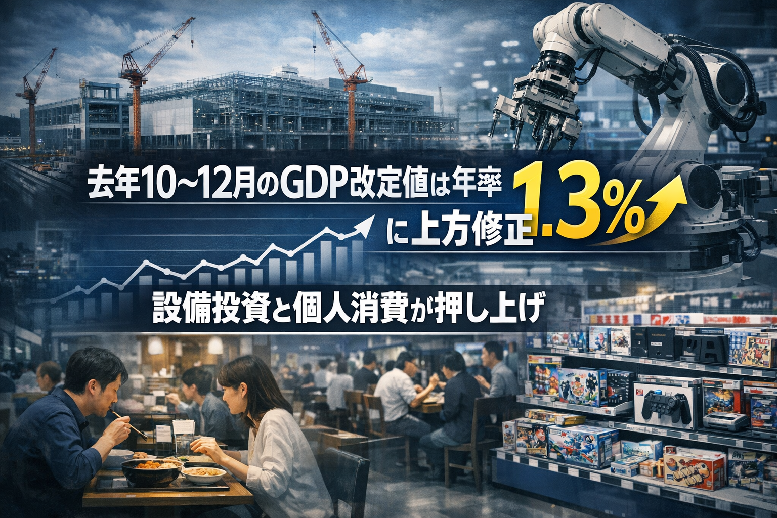 ところが、3月10日に内閣府が発表した改定値は年率換算でプラス1.3%——最初の数字から1.1ポイントも上方修正された。昨年10月から12月(2025年10〜12月期)の日本経済は、当初の速報値が示していたよりも、実態として底堅く推移していたことが明らかになった。