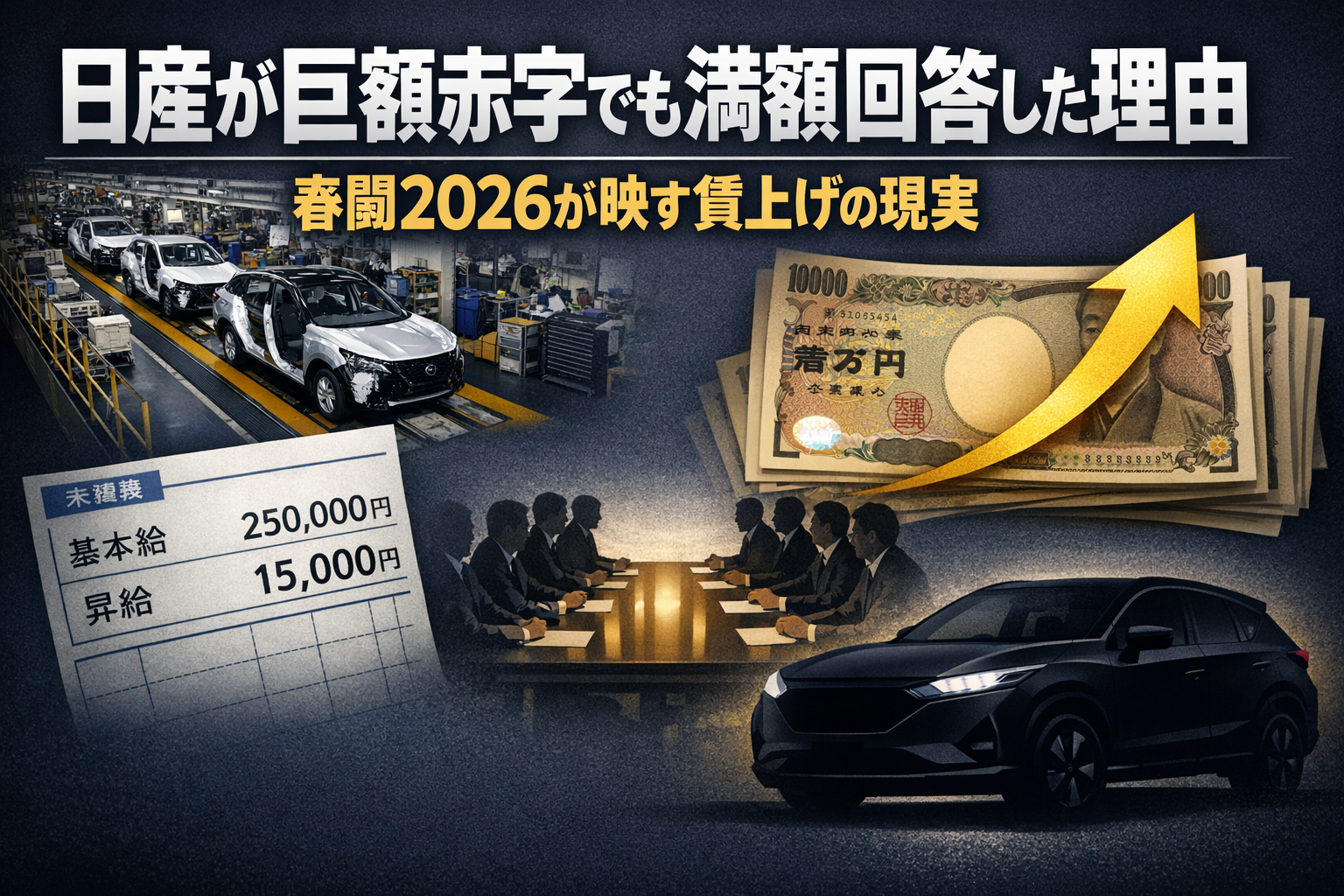 2026年3月11日、日産自動車は今年の春闘交渉において、労働組合の要求に満額回答したと発表した。回答内容は、ベースアップ相当分と定期昇給分を合わせた月額1万円の賃上げと、年間賞与5か月分だ。