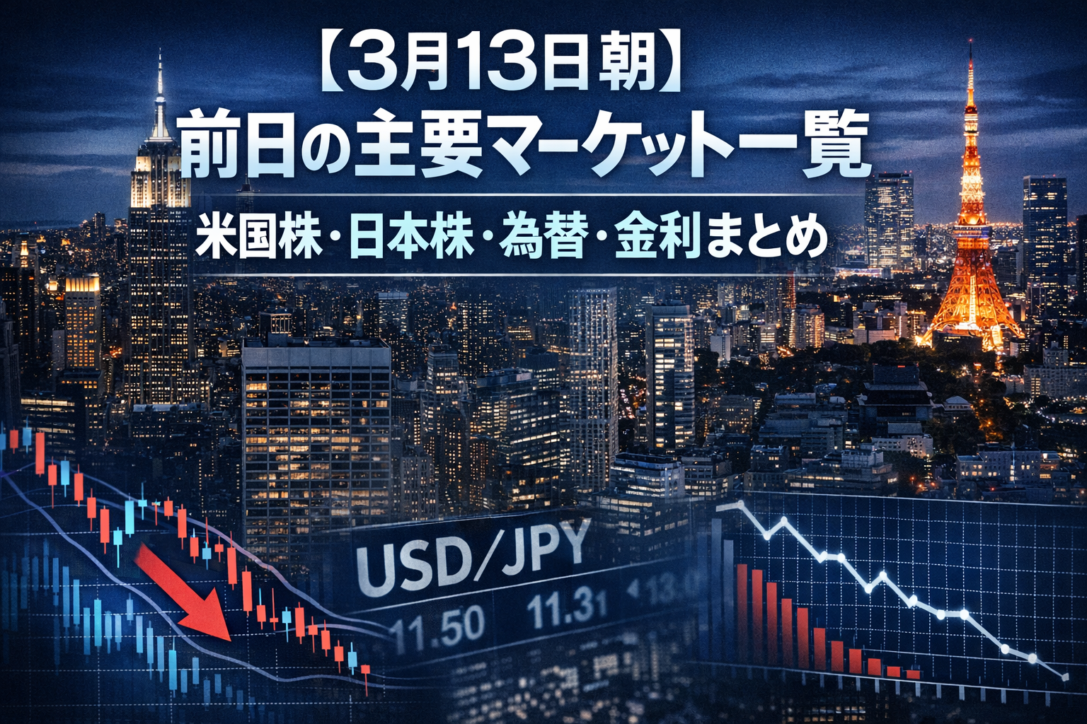 【3月13日朝】前日の主要マーケット一覧|米国株・日本株・為替・金利まとめ