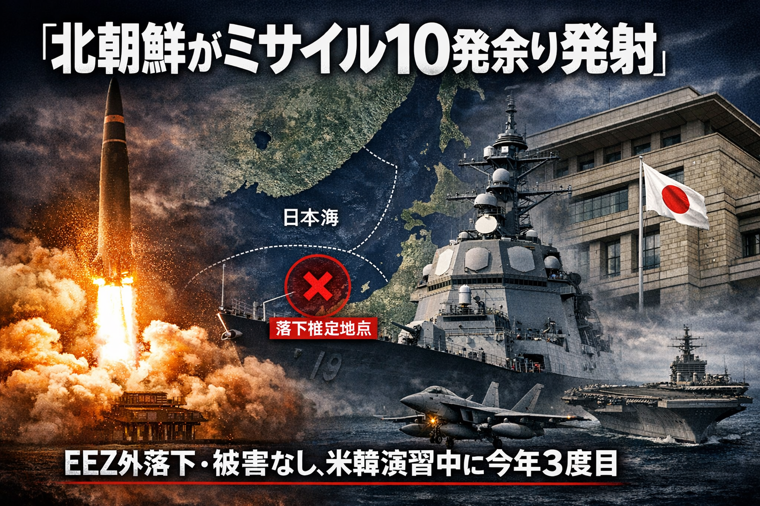 2026年3月14日午後、北朝鮮から弾道ミサイルの可能性がある飛しょう体が発射された。日本側の発表では落下地点はEEZ(排他的経済水域)の外側とみられ、航空機・船舶への被害は確認されていない。一方、韓国軍は発射数を「10発余り」と発表しており、日韓で情報の詳細度に差がある状況だ。