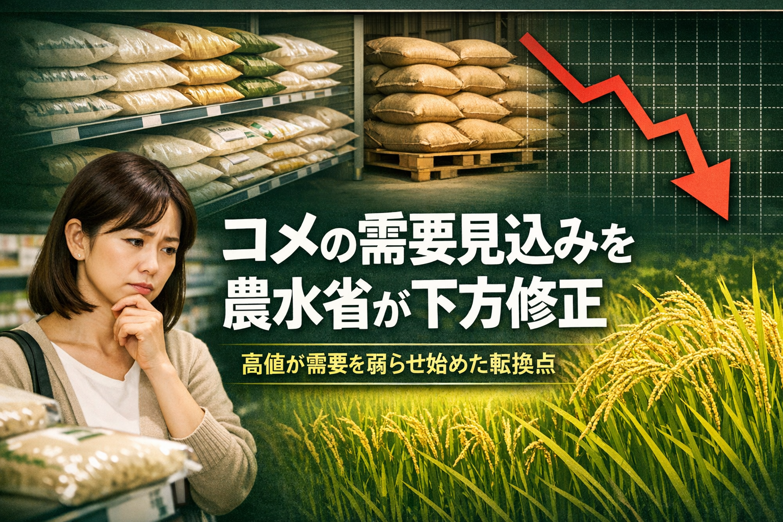 コメが足りない——そんな不安が日本中に広がったのは、つい最近のことだ。スーパーの棚が空になり、価格は急騰した。ところが今度は、農林水産省が需要の見込みを引き下げた。価格が高いまま、コメが「売れにくくなっている」というのだ。