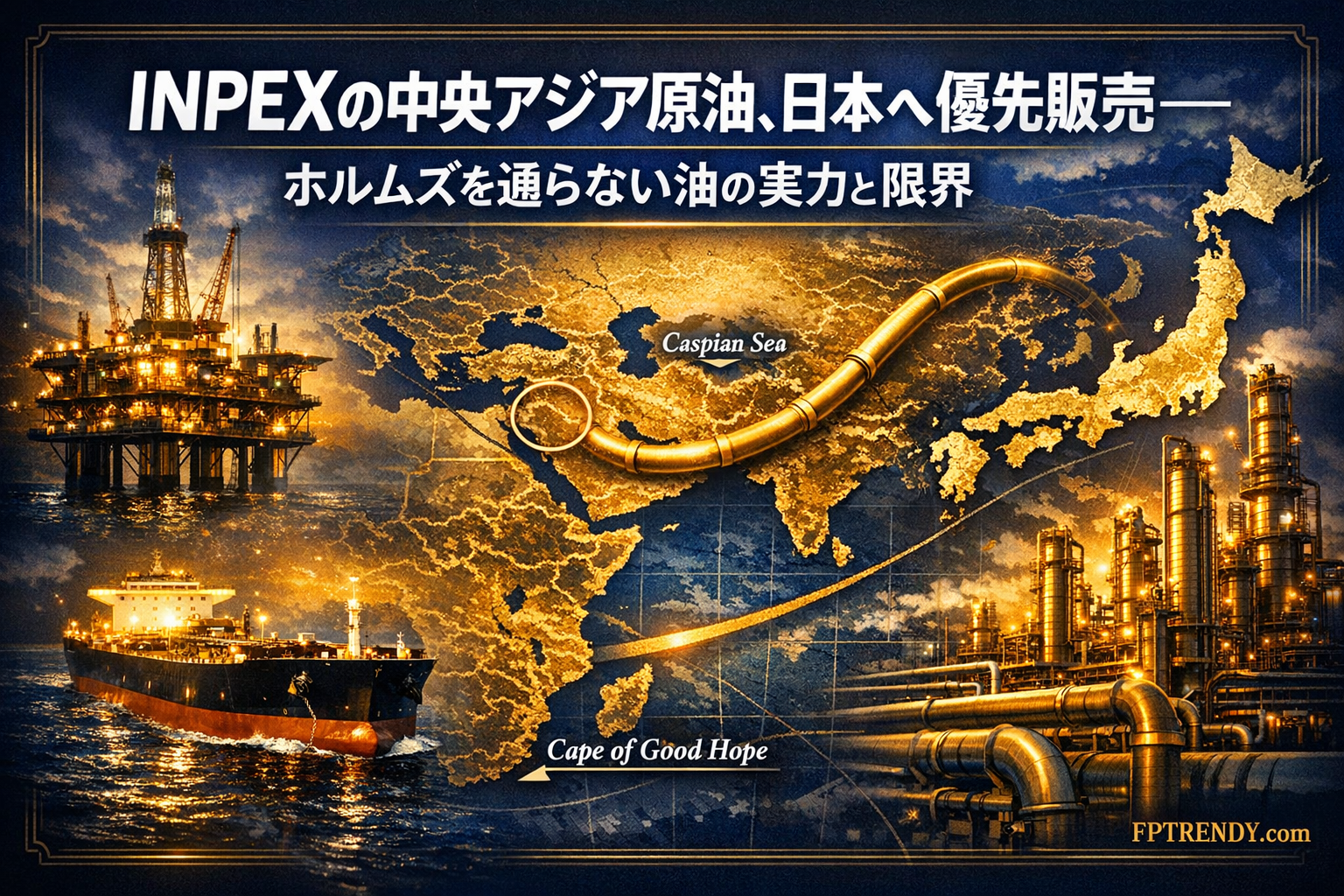 イラン情勢の緊迫化で、ホルムズ海峡を通る中東原油の供給が滞るリスクへの警戒感が高まっている。そのなかで、国が出資する資源開発大手のINPEX(インペックス)が、中央アジアで権益を持つ油田の原油を日本の石油元売りなどに優先的に販売する方針を固めた。「ホルムズを通らない原油」として注目される動きだが、その意味と限界は冷静に見ておく必要がある。