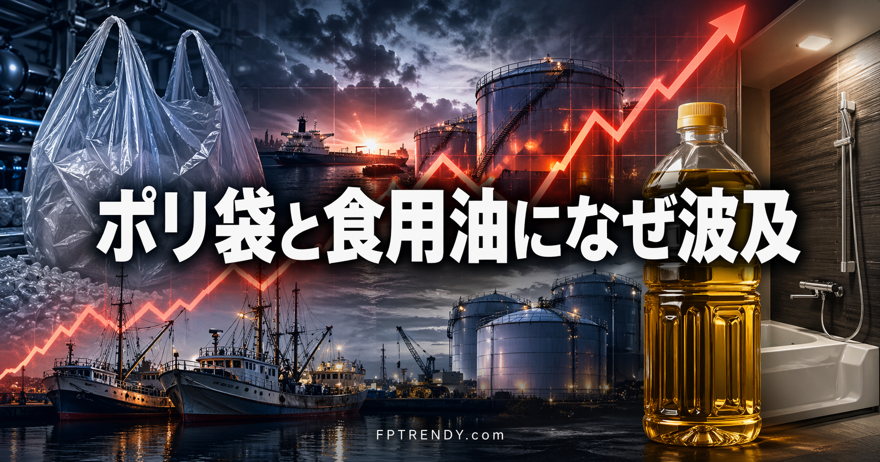 ポリ袋、食用油、漁業、住宅設備は一見ばらばらの話に見えるが、背景には同じ中東情勢の緊迫化がある。ただし、家計に届く経路は一つではない。石油化学原料の流通網を通る経路もあれば、バイオ燃料を経由した植物油相場の経路もある。さらに、重油の現物調達が止まることで一次産業に直接響く経路もある。