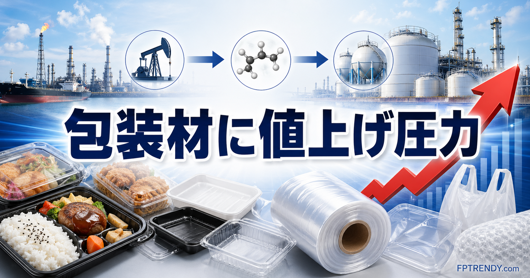 食品の価格が上がる理由は、食材だけではない。弁当を包むフィルム、総菜が入るトレイ、飲料のボトルやキャップなどのコストが上がれば、最終的に商品価格に転嫁される可能性がある。