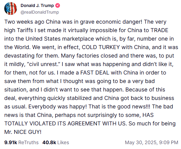 「完全に破った」トランプ大統領が中国の貿易合意違反をSNSで強く非難|米中交渉の現状と今後の展望