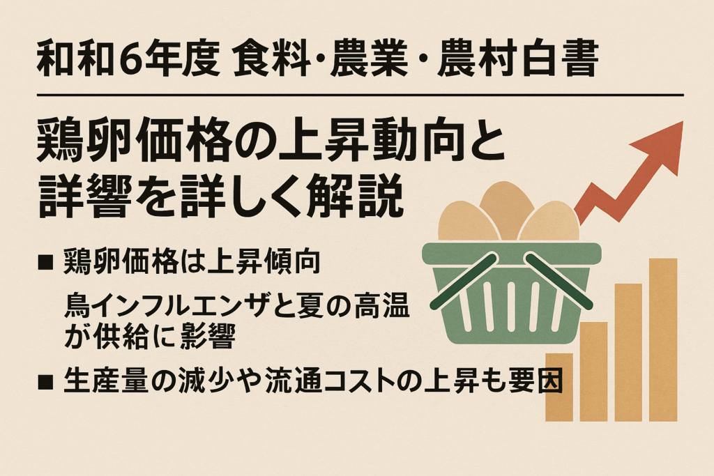 令和6年度食料・農業・農村白書をもとに、鶏卵価格の上昇動向とその背景、鳥インフルエンザや夏の高温による供給影響、生産量の減少、流通コストの上昇など複合要因を詳しく解説。今後の価格推移や消費者への影響も紹介します。