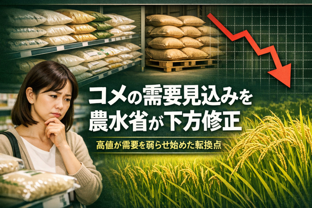 農水省がコメの需要見込みを7万トン下方修正。価格高止まりが消費を弱らせ、卸は精米を控え始めた。需要は下がるのに作付意向はなお高水準——「足りない」から「高値で売れにくい」へ、コメ市場の転換点をわかりやすく解説する。 -