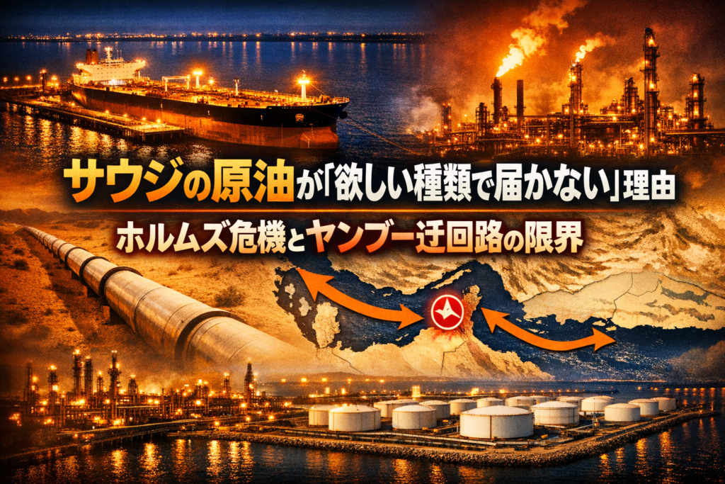 ホルムズ海峡の通航リスク急上昇で、サウジアラムコは紅海側のヤンブー港へ原油輸出を振り替えた。しかしヤンブーは量も油種も完全代替できない。「原油はあるのに届かない・欲しい種類で届かない」二重の制約を解説する。 -