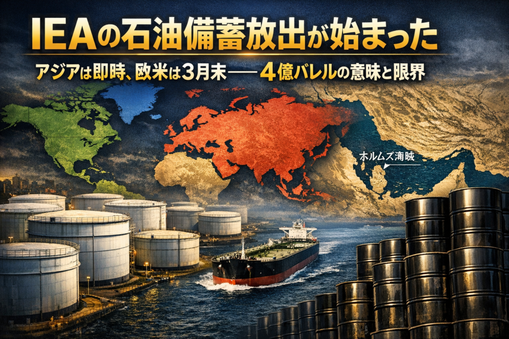 IEAが石油備蓄協調放出の地域別スケジュールを公表。アジア・オセアニアは即時開始、米州・欧州は3月末から。放出量は合計4億1000万バレル超。「直ちに始まる」の意味と、備蓄放出の限界をわかりやすく解説する。 -