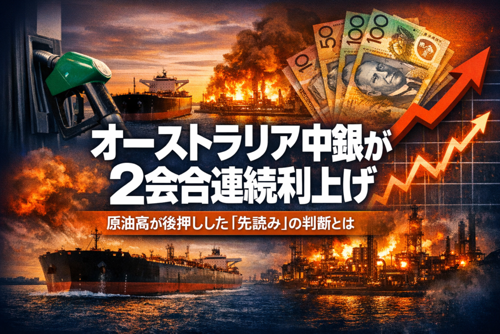 オーストラリア中央銀行(RBA)が2会合連続で利上げを決定。政策金利は4.10%へ。イラン情勢による原油高が追加リスクとなったが、主因は2025年後半から再加速した国内インフレだった。5対4の僅差が示す、中央銀行の難しい判断を解説。 -