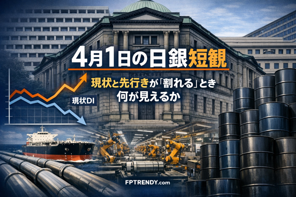 4月1日公表の日銀短観の見どころは「景況感が改善か悪化か」ではない。現状DIは底堅いまま、先行きDIだけが悪化する「割れ方」が出るかどうかだ。原油高・供給不安がまず企業の先行き判断に入り込むなら、それはエネルギー危機が企業心理を動かし始めた早い段階のサインになる。 -