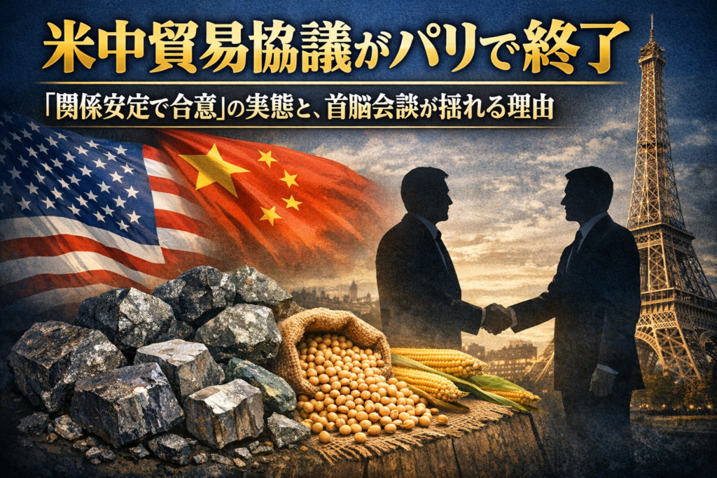 パリで2日間行われた米中貿易協議が終了。両国は「関係安定」を強調したが、その実態は「関係悪化の防止」。農産物・重要鉱物・投資枠組みが議題となる中、首脳会談の日程はイラン情勢で揺れている。 -