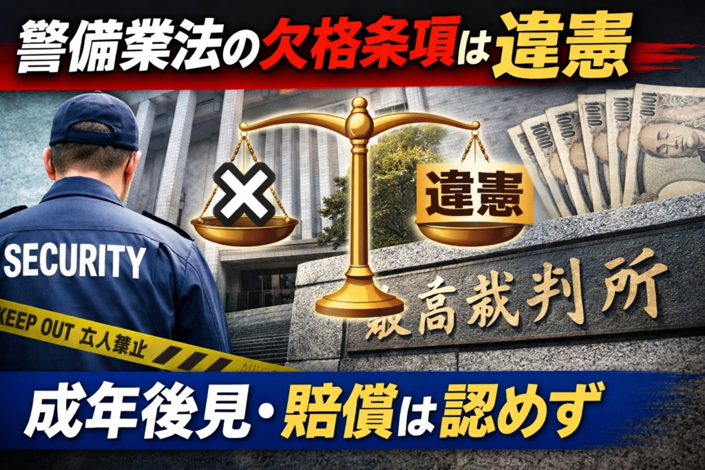 成年後見制度(保佐)の利用を理由に警備業務から一律に排除していた旧・警備業法の欠格条項について、最高裁大法廷が「憲法違反」と初判断。一方で国への損害賠償請求は退けた。判決のポイントと、違憲でも賠償が認められなかった理由を整理する。 -