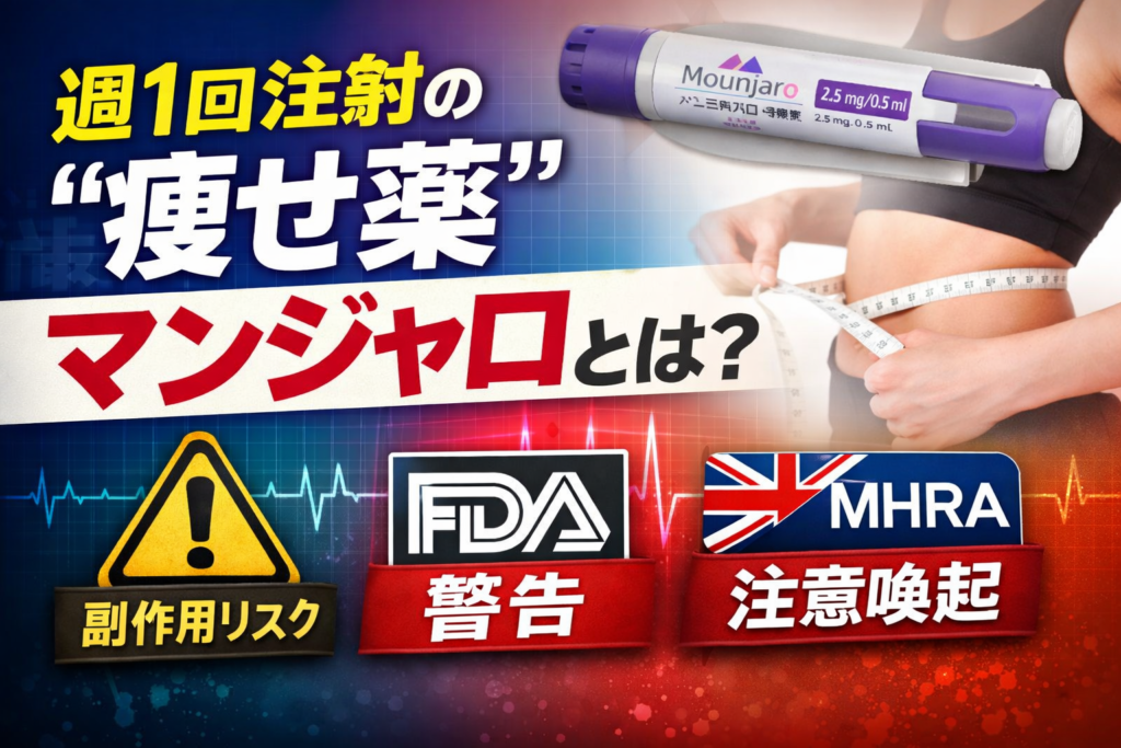 SNSで「週1回注射の痩せ薬」として話題になるマンジャロ(チルゼパチド)は、本来2型糖尿病の治療薬。オンライン診療や自由診療での広がりの背景を整理し、よくある副作用から重篤化し得るリスク、米FDAの枠付き警告、英国MHRAの注意喚起、肥満症薬ゼップバウンドとの制度上の違いまで、公的資料ベースでまとめる。 -