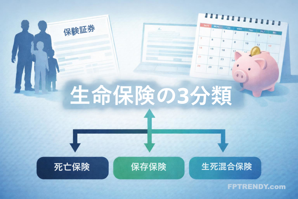 生命保険の3分類である死亡保険、生存保険、生死混合保険の違いを、保険金が支払われるタイミングから整理する。定期保険、終身保険、養老保険、学資保険、個人年金保険とのつながりも分かりやすく確認する。 -