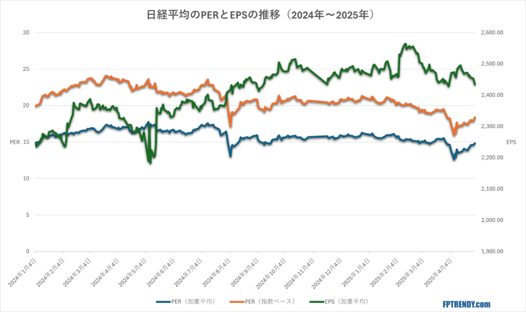 日経平均のPERとEPSの推移(2024年〜2025年)