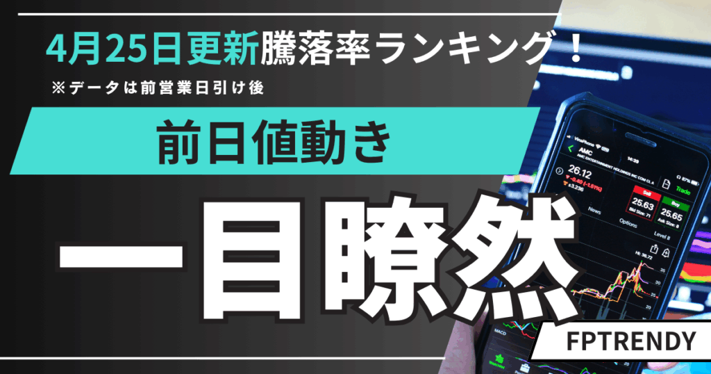 2025年4月25日朝更新の株式騰落率ランキング記事。日本株・米国株の上位6銘柄と日経225、TOPIX、S&P500、ドル/円、米10年債利回りなど主要指標をサクッと確認できます。 -